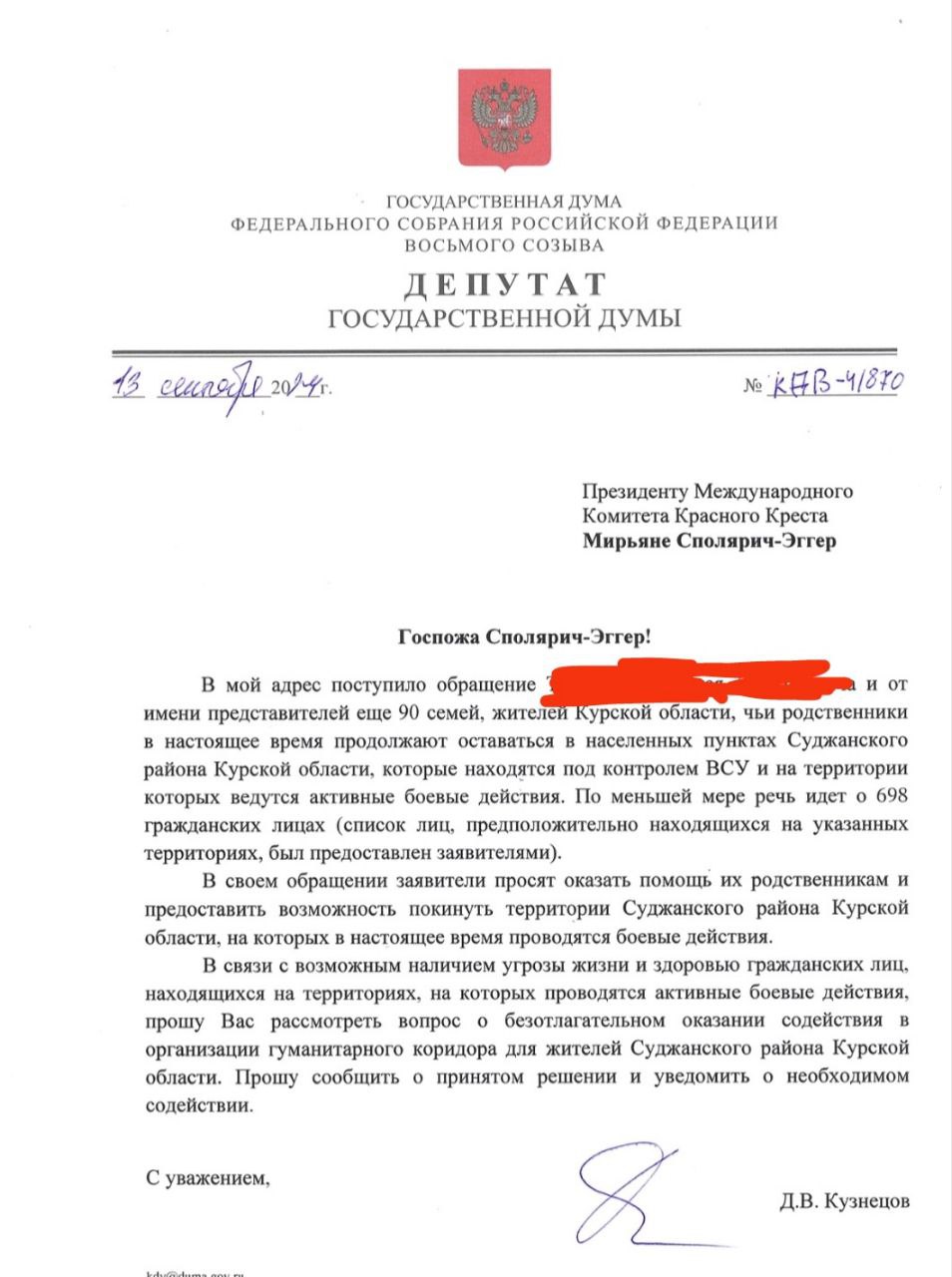 Священник от имени 90 семей обратился с просьбой помочь обеспечить гуманитарный коридор для эвакуации с территории Курской области, занятой ВСУ.